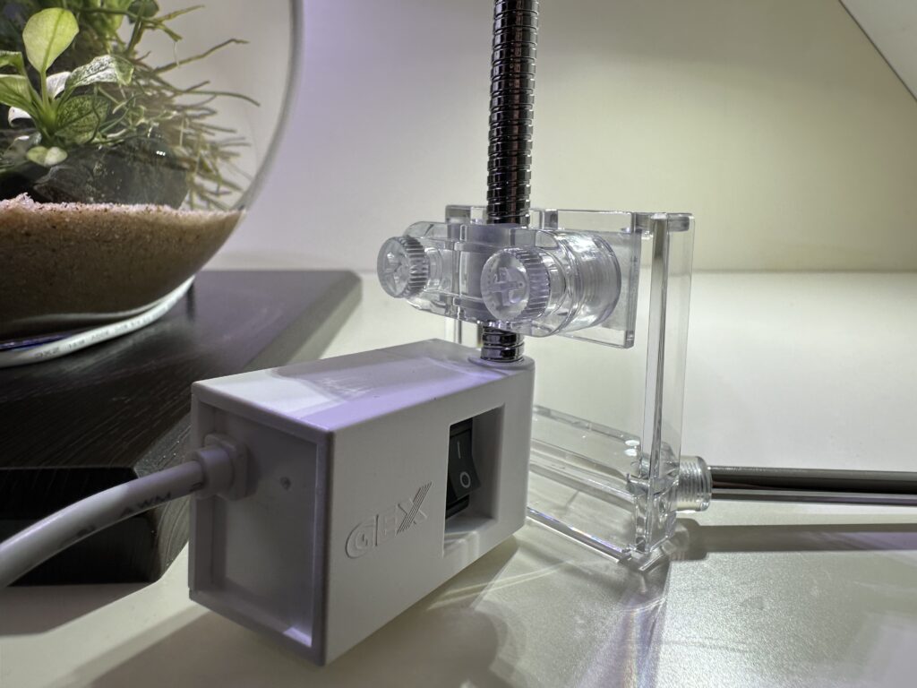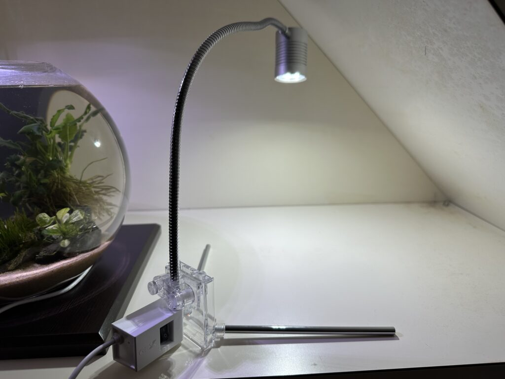 LED部分のランプのような形状やフレキシブルなアーム、付属のスタンドでの自立使用が出来る点など、ボトルやガラスポットを用いた小さなアクアリウムをより意識した仕様。