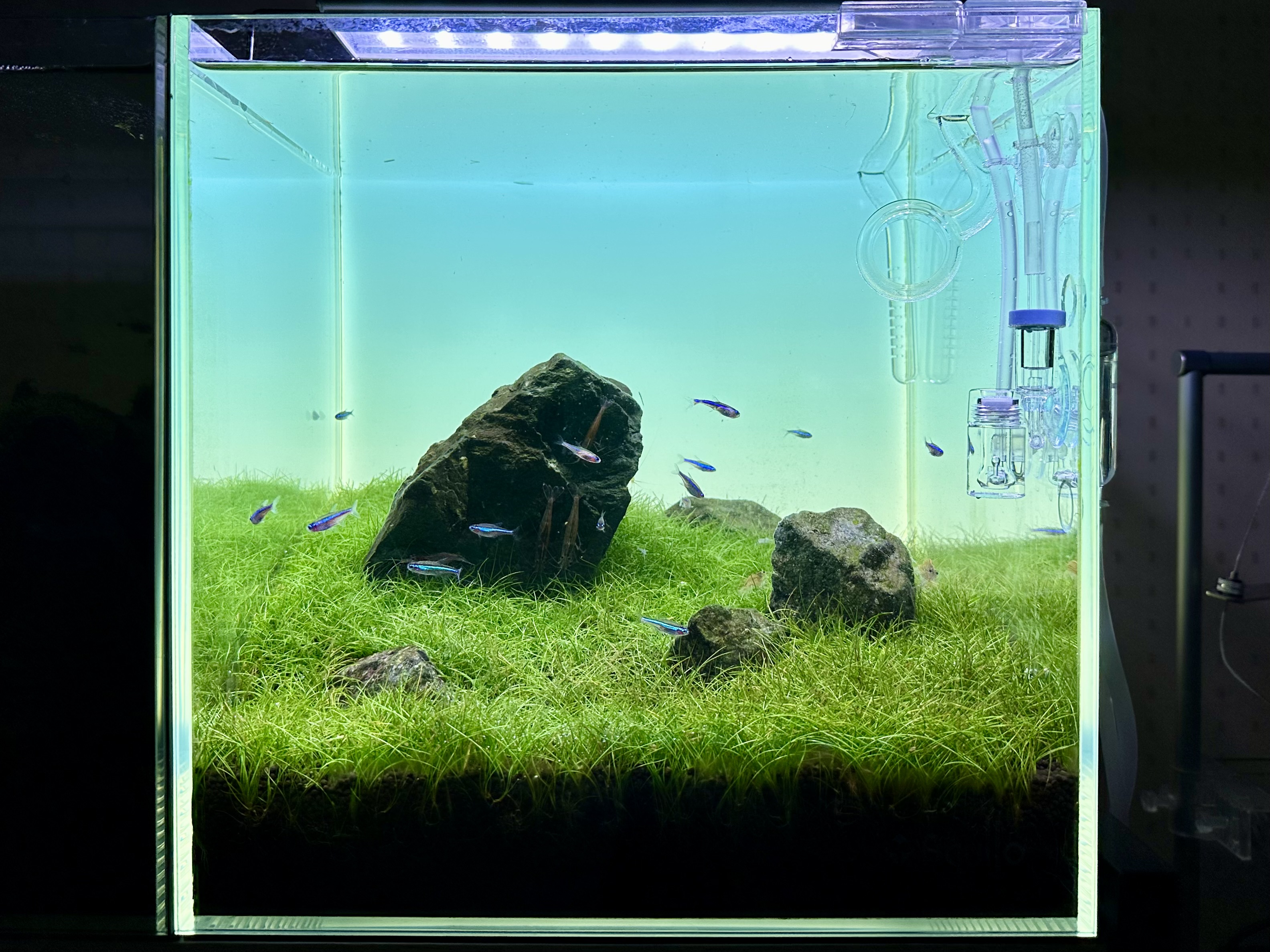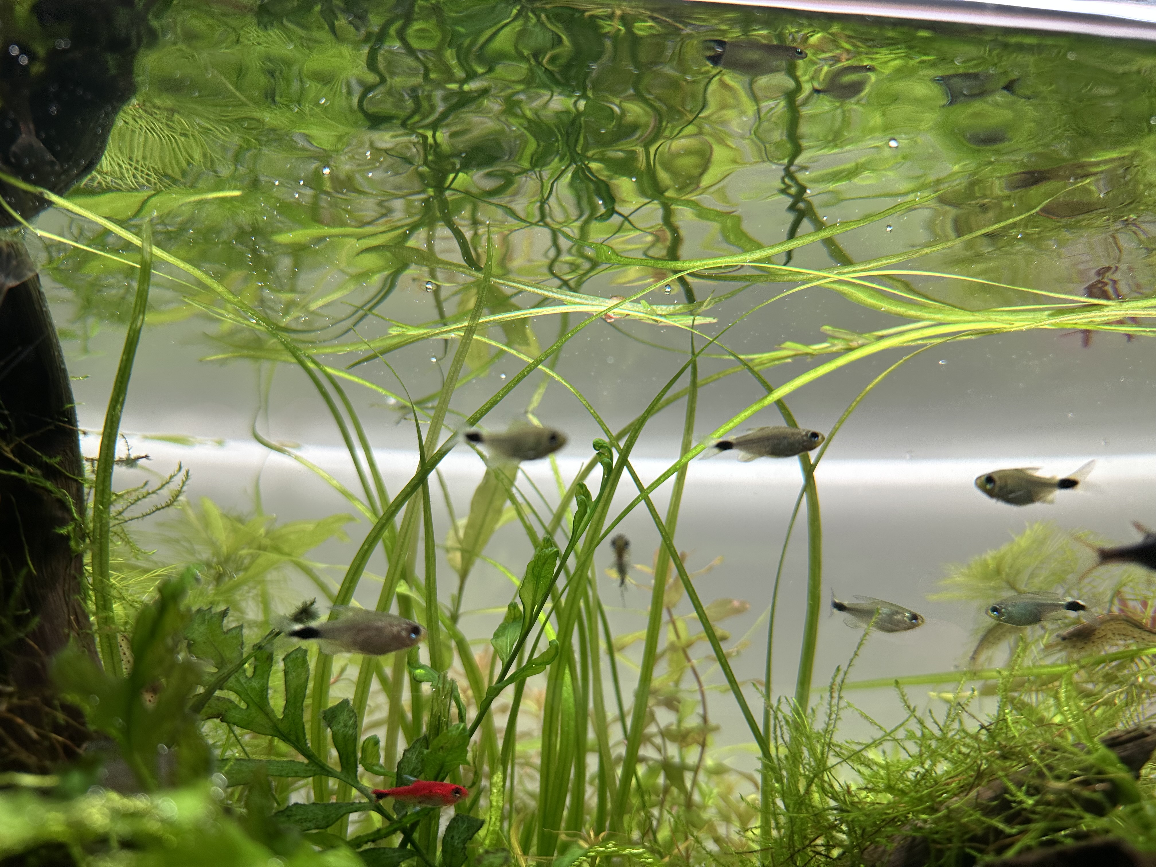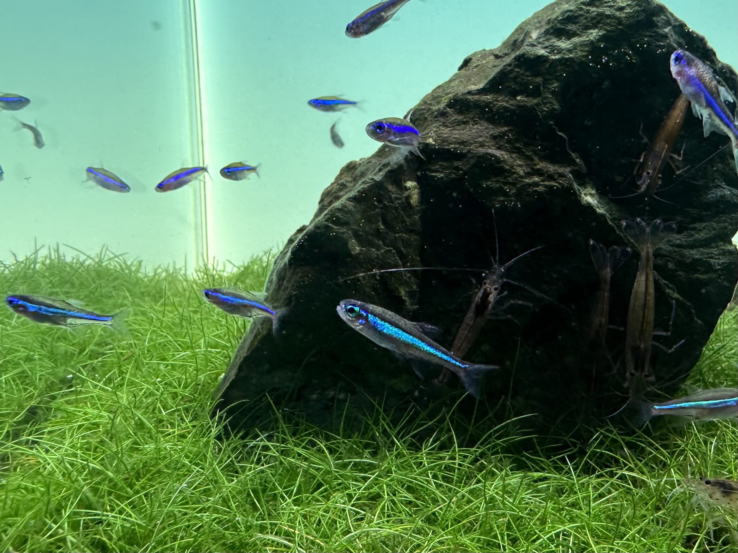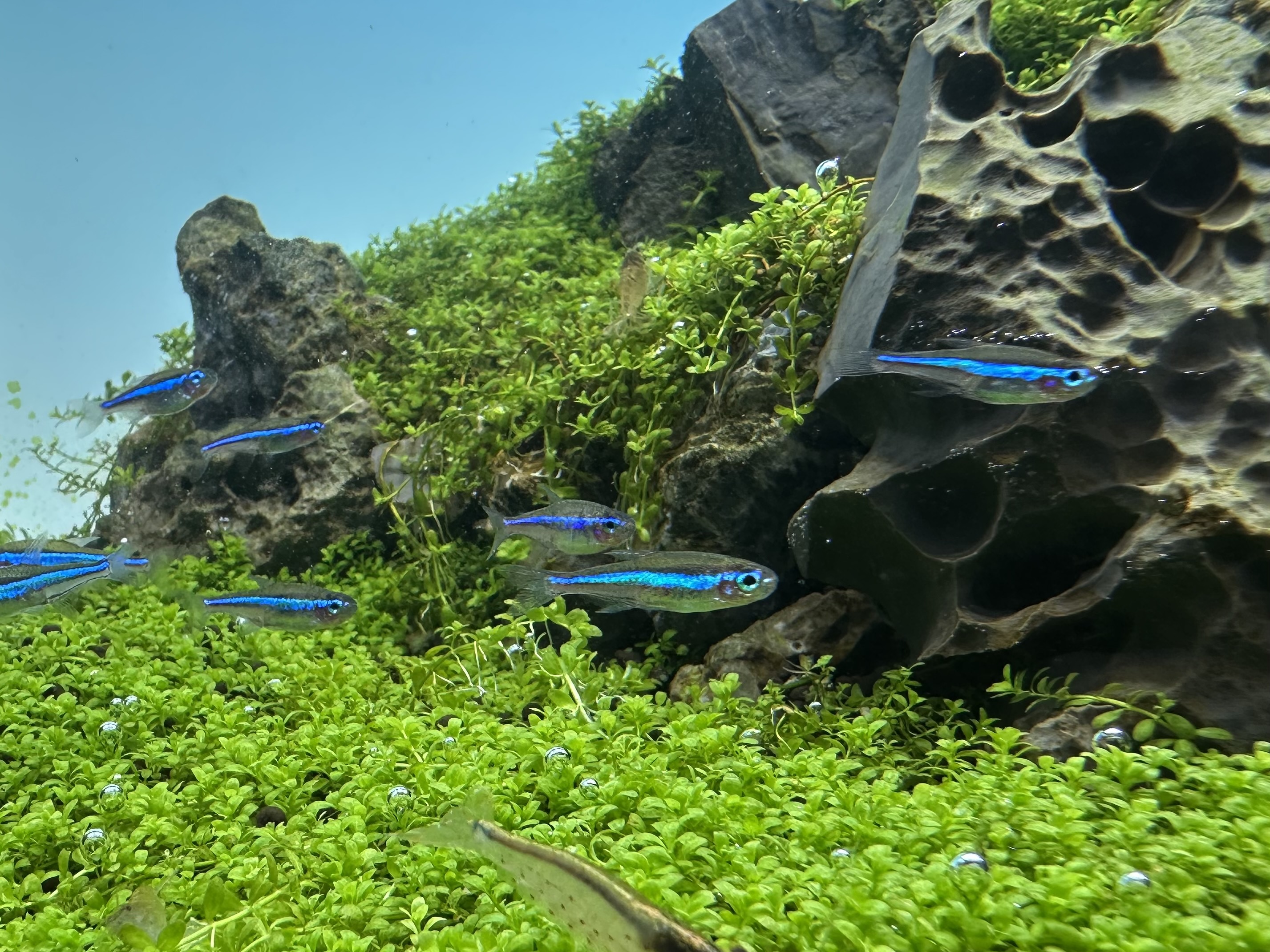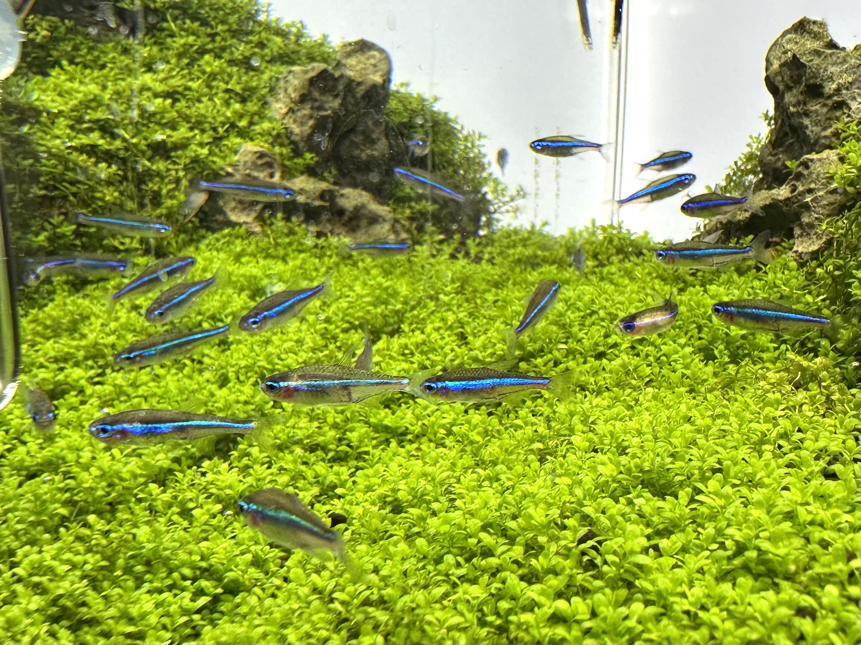 小型で美しく、群泳をよくするグリーンネオンテトラはまさにこのようなレイアウトにピッタリ。