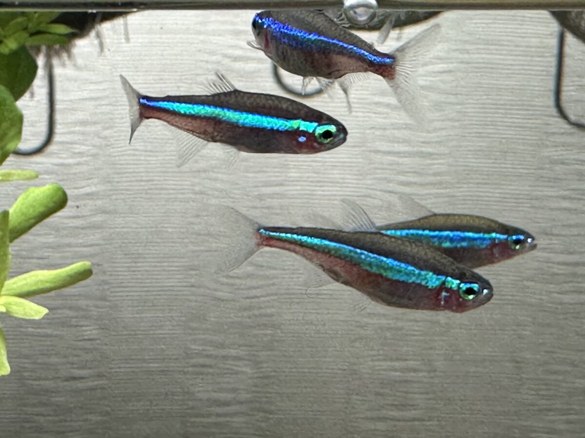 一方でグリーンネオンテトラは最大でも3~3.5cmと、この中では最も小型なサイズです。