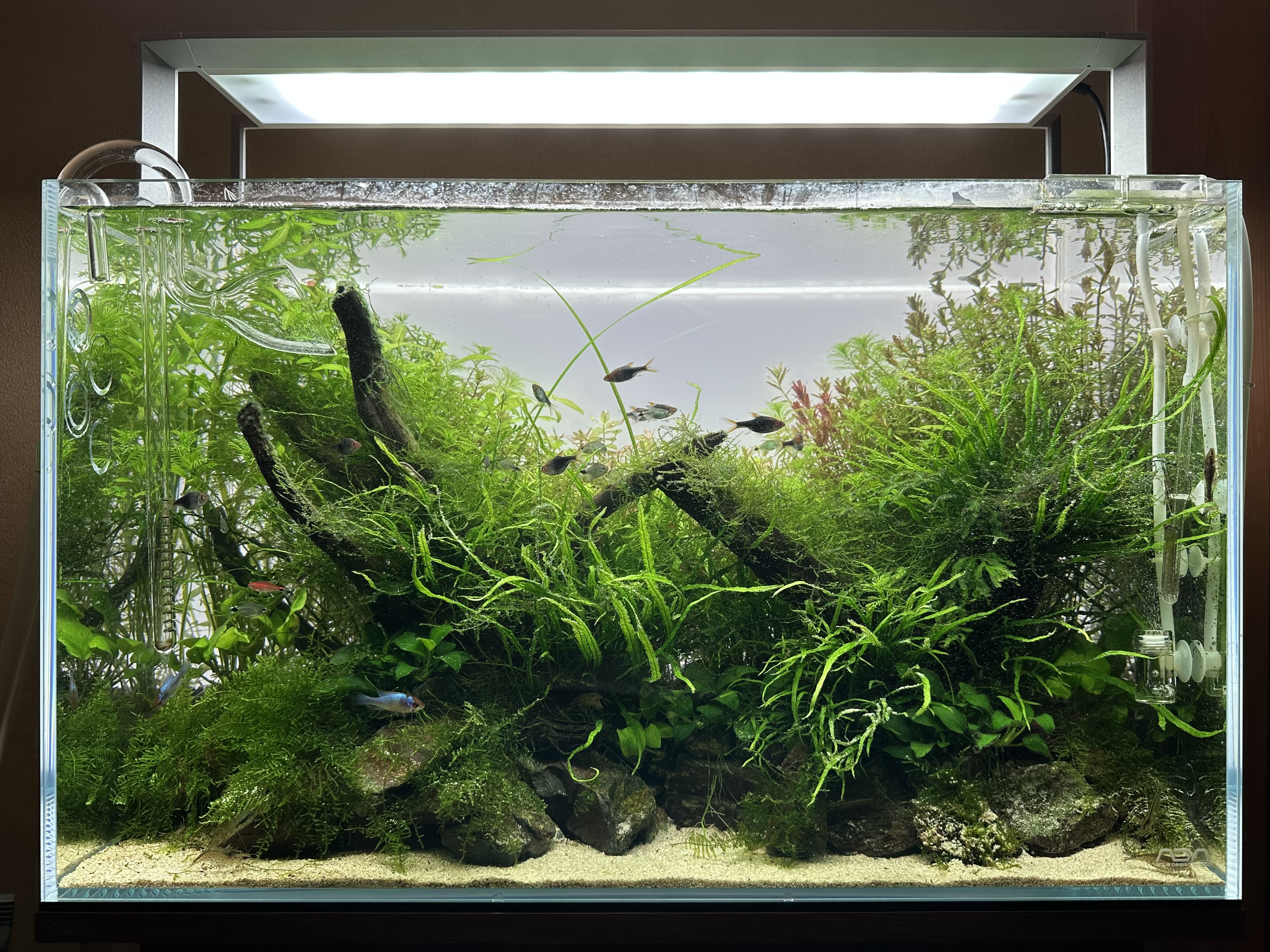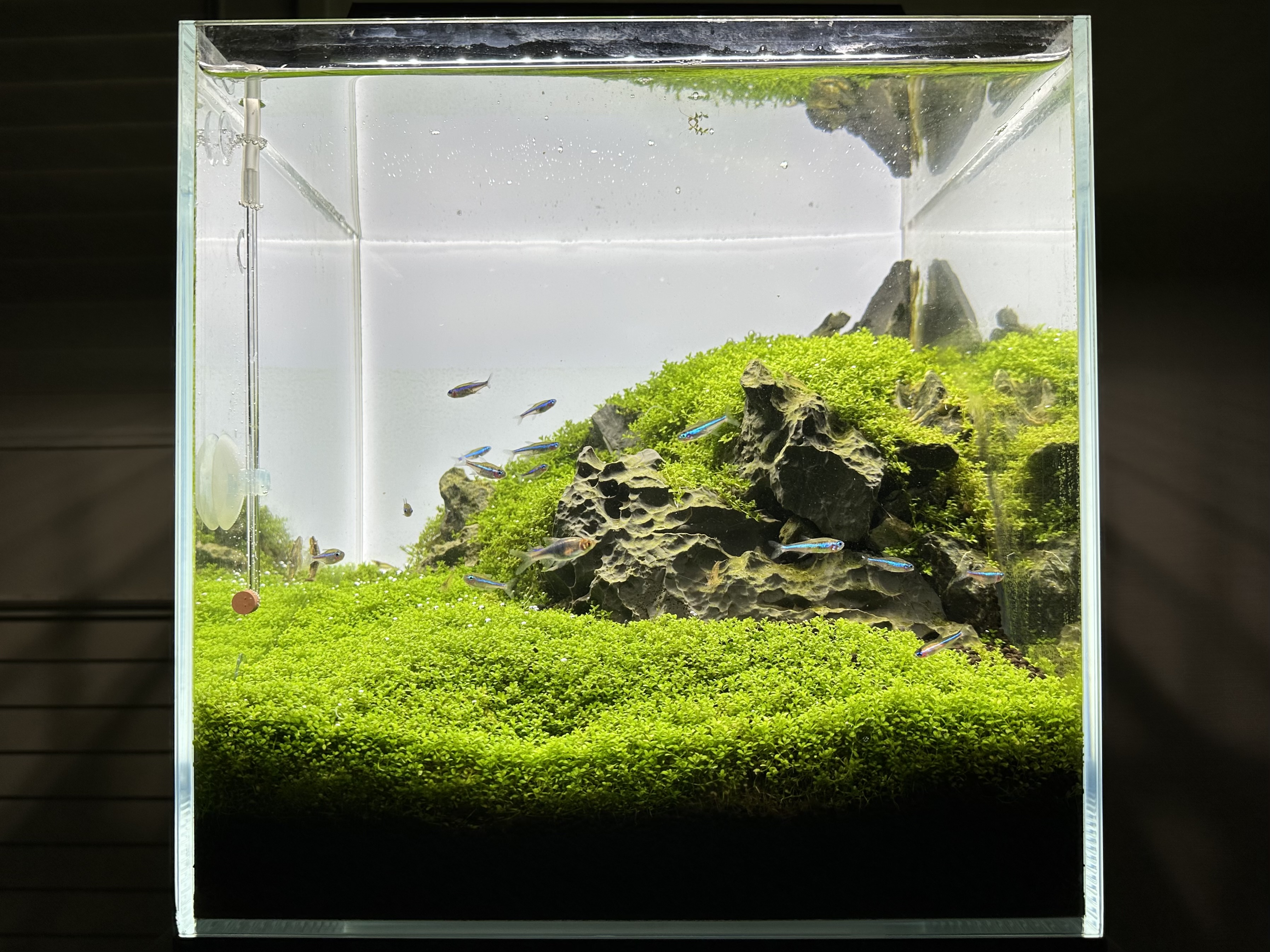 流木を少し水面に出したり、岩を部分的に露出させるだけでもグッと立体感が出ます。