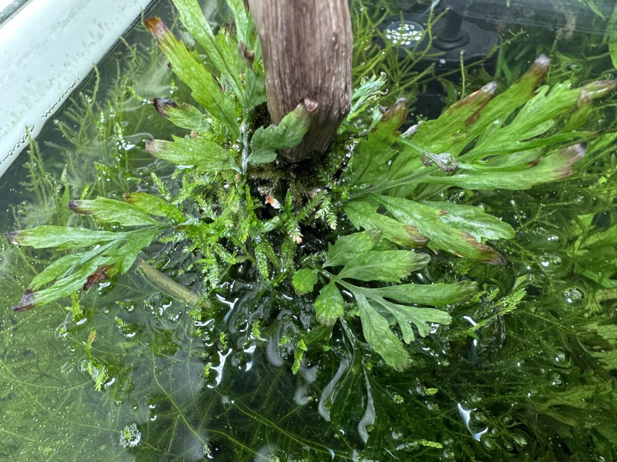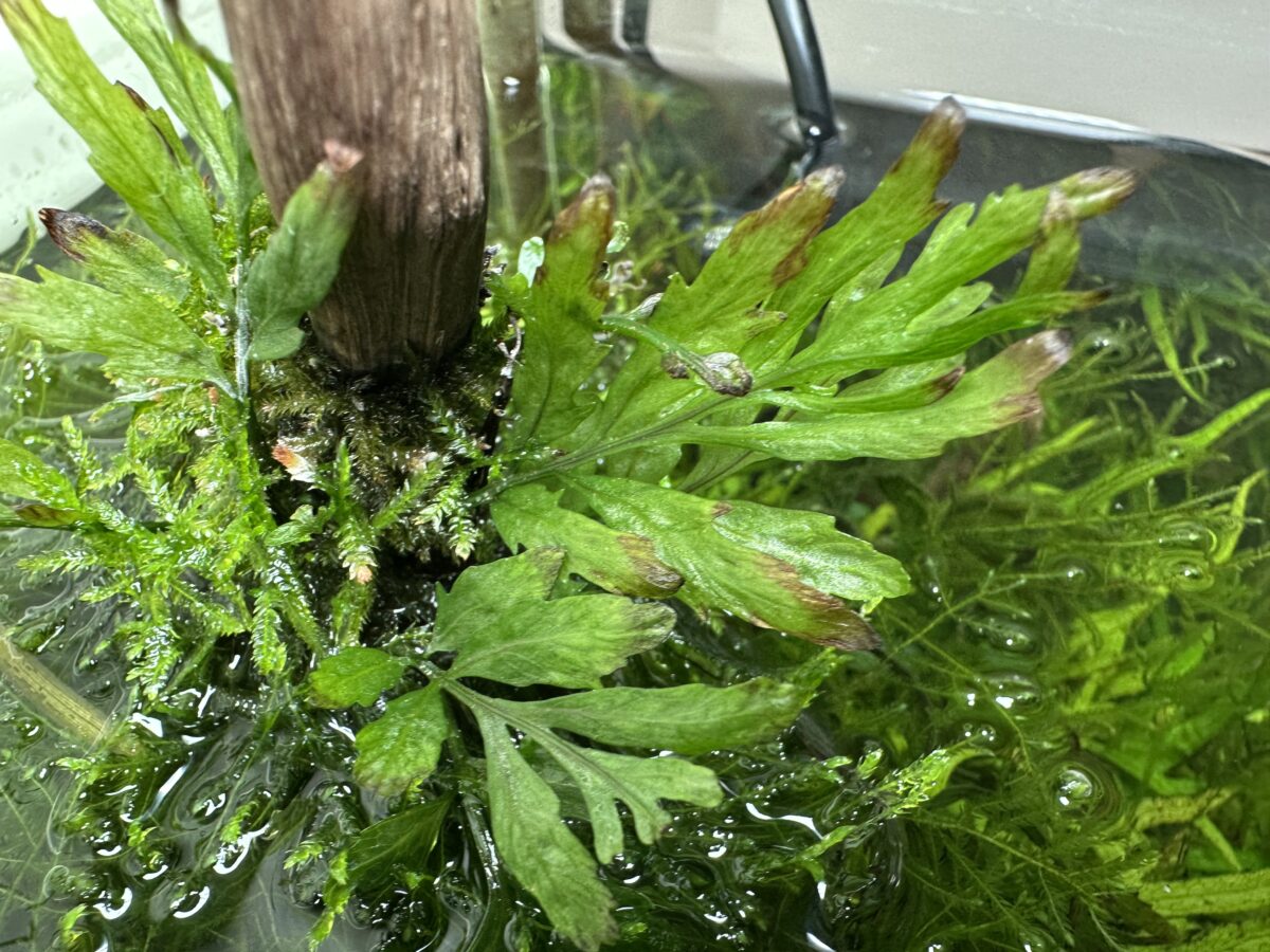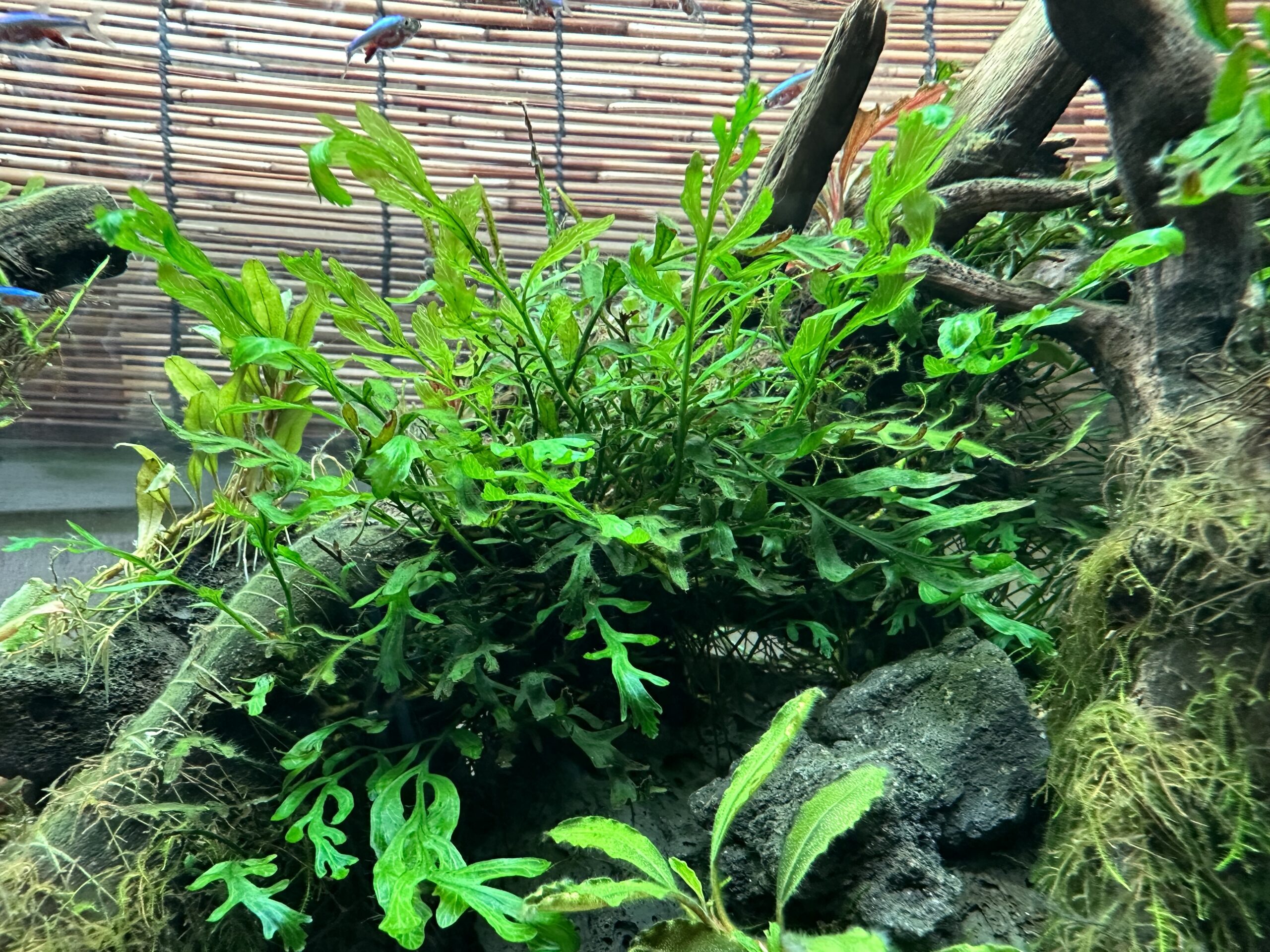 アフリカ原産のシダ類の植物で、透明で深い緑色とそのシダ然とした佇まいが水中に自然観を出してくれる水草水槽に無くてはならない植物です。