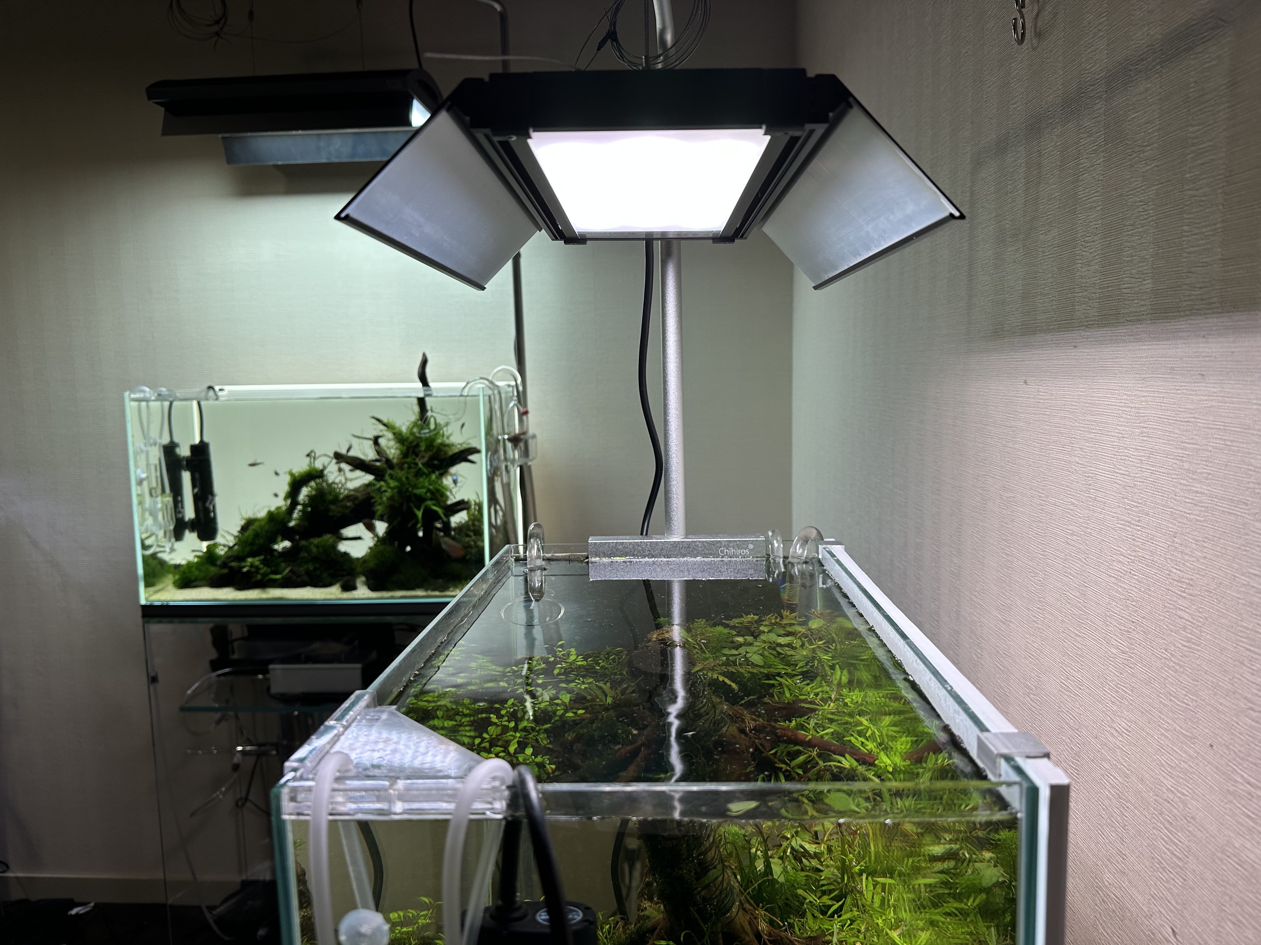 通常の足を用いて水槽上に設置する据え置き型の照明では十分な高さを得ることが出来ない為です。