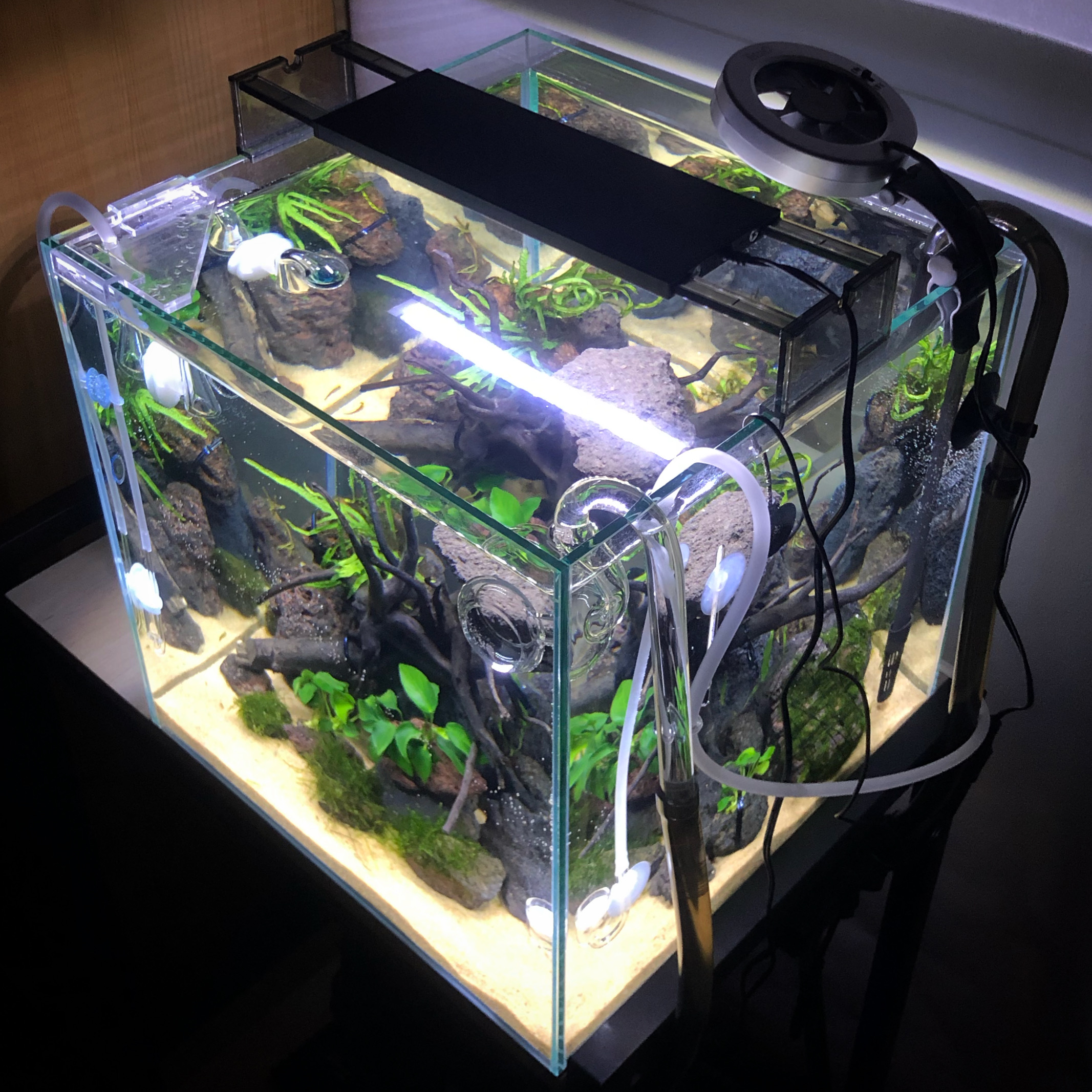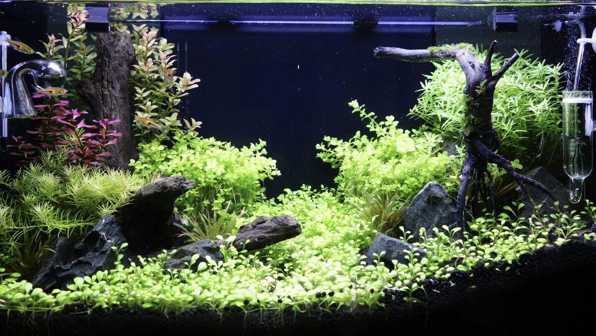 今回は45㎝オーバーフロー水槽を使用した陽性水草が主体の流木レイアウトをご紹介します。